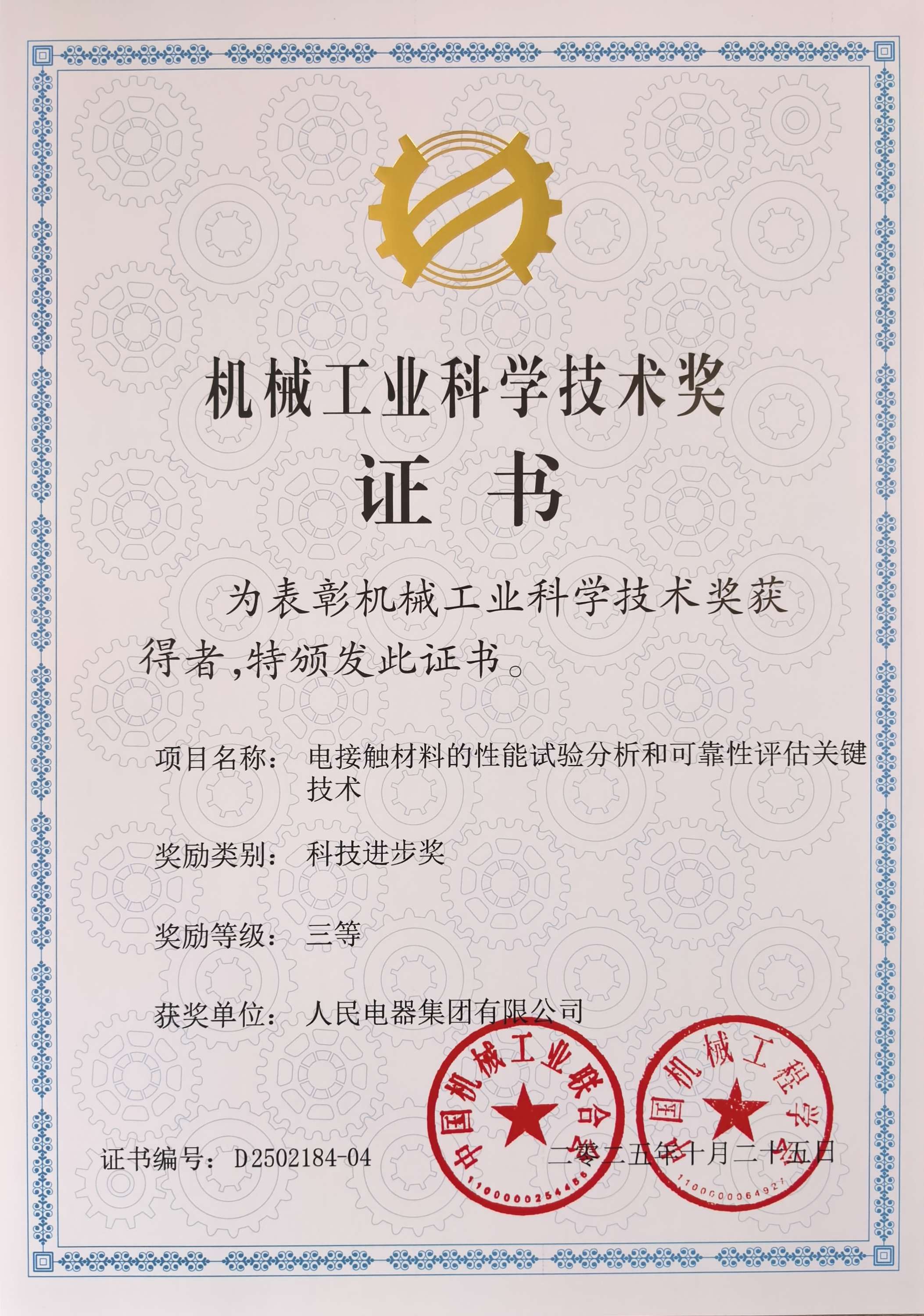 喜报丨人民电器集团荣获机械工业科学技术奖科技进步奖 人民电器报 2025年12月03日 本报记者 近日,中国机械工业联合会、中国机械工程学会正式发布关于表彰2025年度“机械工业科学技术奖”获奖项目的通报,中国・人民电器集团凭借在“电接触材料的性能试验分析和可靠性评估关键技术”项目中的突出贡献,成功荣获该奖项科技进步奖三等奖。 “机械工业科学技术奖”是经国家科学技术奖励办公室批准设立的机械工业领域唯一全国性科学技术奖项,旨在表彰在机械工业科技创新中取得显著成果、为行业科技进步作出重要贡献的项目与单位,对引领机械工业高质量发展、推动产业技术升级具有关键作用,其评选标准严格、权威性高,是行业内衡量科技创新实力的重要标杆。 在该项目中,人民电器集团创新研制了“电接触材料性能测试分析系列装备”,涵盖触头材料耐烧蚀电性能测试设备、触头材料电接触性能及寿命测试设备、非接触式微观性能测试分析设备。该系列装备深度融合耐烧蚀测试、接触模拟测试、形貌检测和性能分析功能,全面满足电接触材料多场景测试需求。 此次荣获“机械工业科学技术奖”,是行业对人民电器集团科技创新能力的高度认可,更是集团持续深耕电力装备与新材料领域的重要成果体现。未来,人民电器集团将以此为契机,进一步加大科研投入力度,聚焦关键核心技术突破,不断提升自主创新水平,为推动机械工业科技进步、助力国家制造业高质量发展贡献更多“人民力量”。